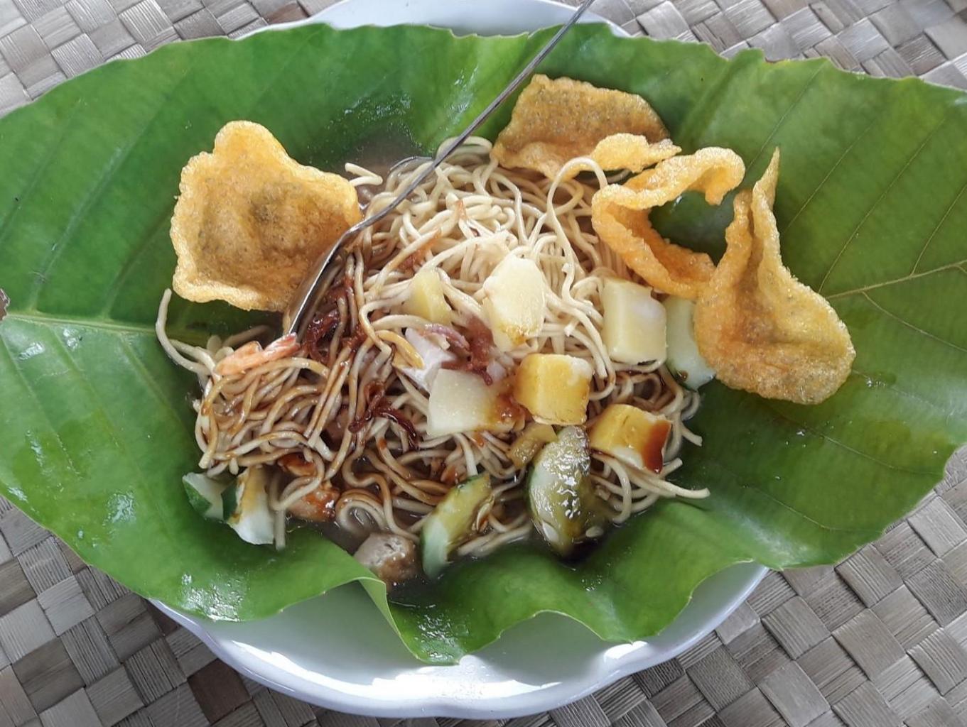 Mie Rebus Belitung ini kalau di Desa Wisata Kreatif Terong ada dua warung yang menjualnya secara rutin setiap hari. Dan dua-duanya punya usaha masyarakat lokal. Yang membuat Mie Rebus Belitung ini peunya kekhasan tersendiri karena disajikan di atas piring yang dilapisi Daun Simpor yang menimbulkan aroma unik, ditambah lagi dengan kuahnya yang mengandung kaldu udang lokal makin membuat wangi dan gurih rasanya. Biasanya selama ini kalau ada tamu/wisatawan yang berkunjung dan menginap di homestay pasti akan dibawa dulu ke salah satu warung tradisional untuk menikmati Mie Rebus Belitung ini sebagai tanda perkenalan baru masuk Desa Wisata Kreatif Teong. Bahan-bahan lainnya yang dicampurkan dalam sajian Mie Rebus Belitung ini adalah rebus kentang, potongan tahu goreng yang dipotong dadu kecil dan pakai emping atau kerupuk. Satu porsinya sudah lebih dari cukup untuk membuat kenyang perut, apalagi jika ditambahkan satu butir telur ayam rebus akan menambah selera makannya.